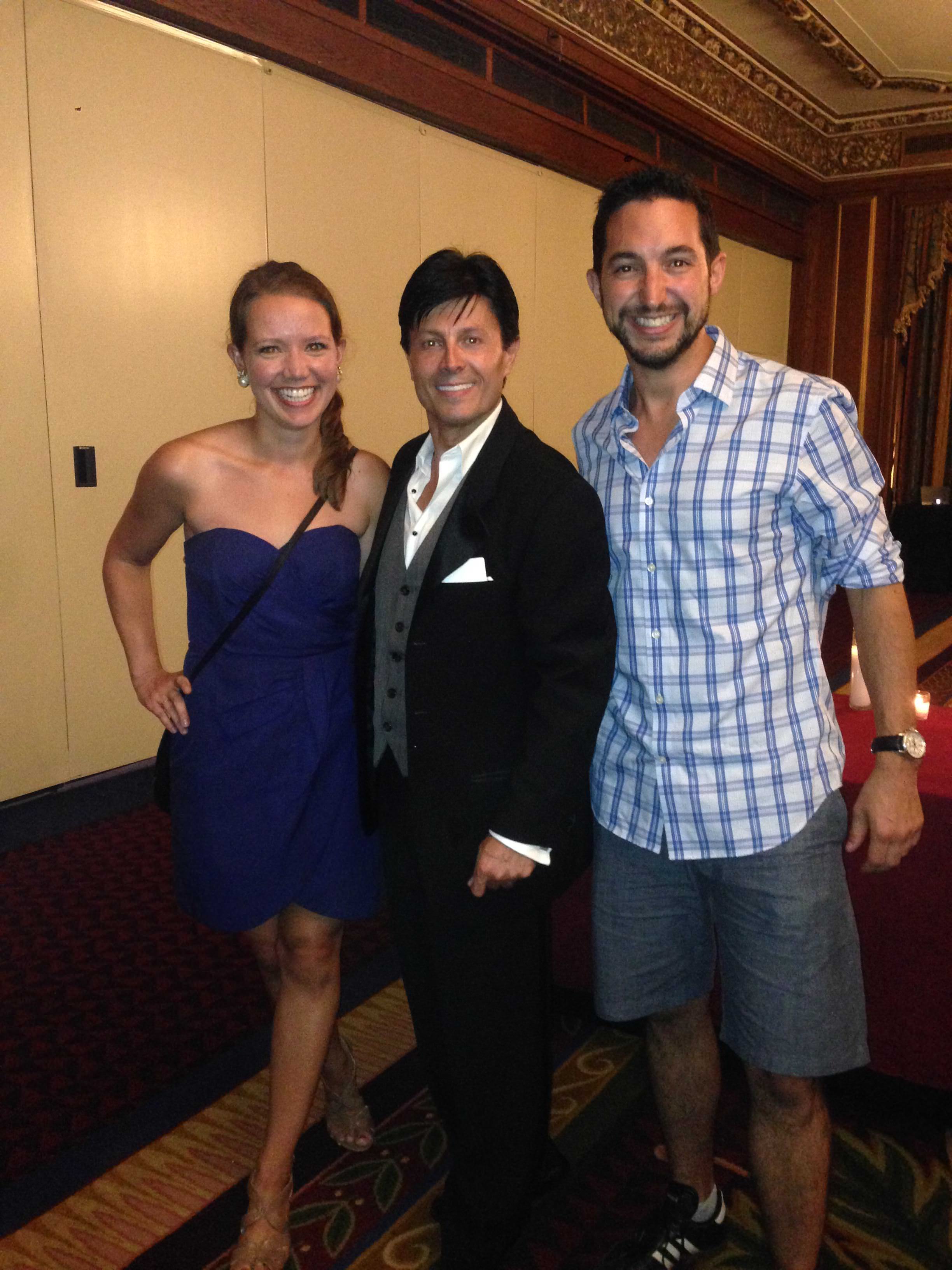 The magician stands on his tippy-toes for a picture with the happy couple.